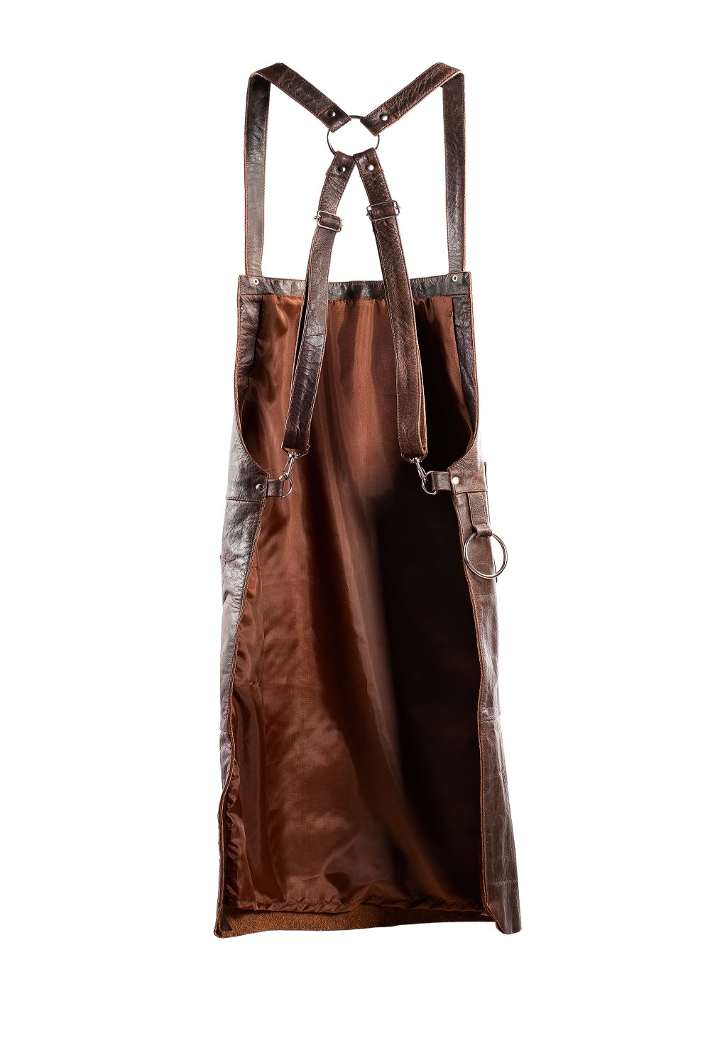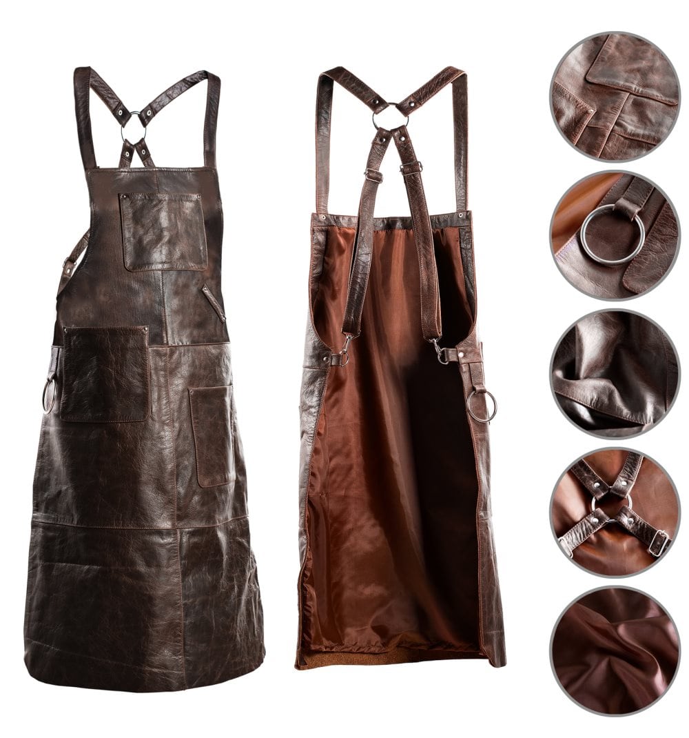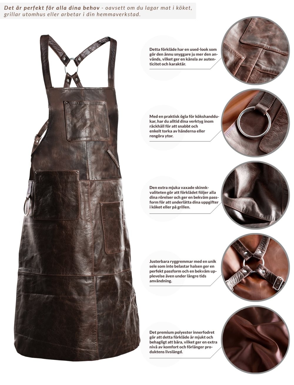 • Den extra mjuka vaxade skinnkvaliteten gör att förklädet följer alla dina rörelser och ger en bekväm passform för att underlätta dina uppgifter i köket eller på grillen.