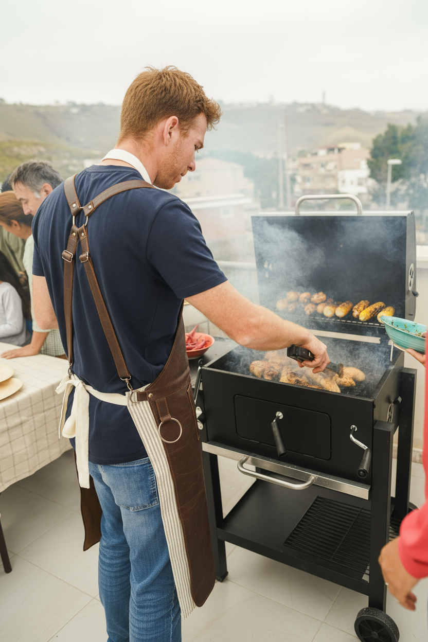 • För att hålla dina grillverktyg på plats, har detta förkläde en läderband på framsidan, vilket ger en praktisk och elegant lösning för din utrustning.