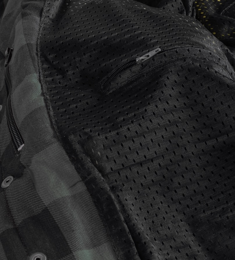 Flanell motorcykel skjorta kombinerat med hög säkerhet med CE Level-1 skydd för axlar och armbågar samt ryggplatta ingår.