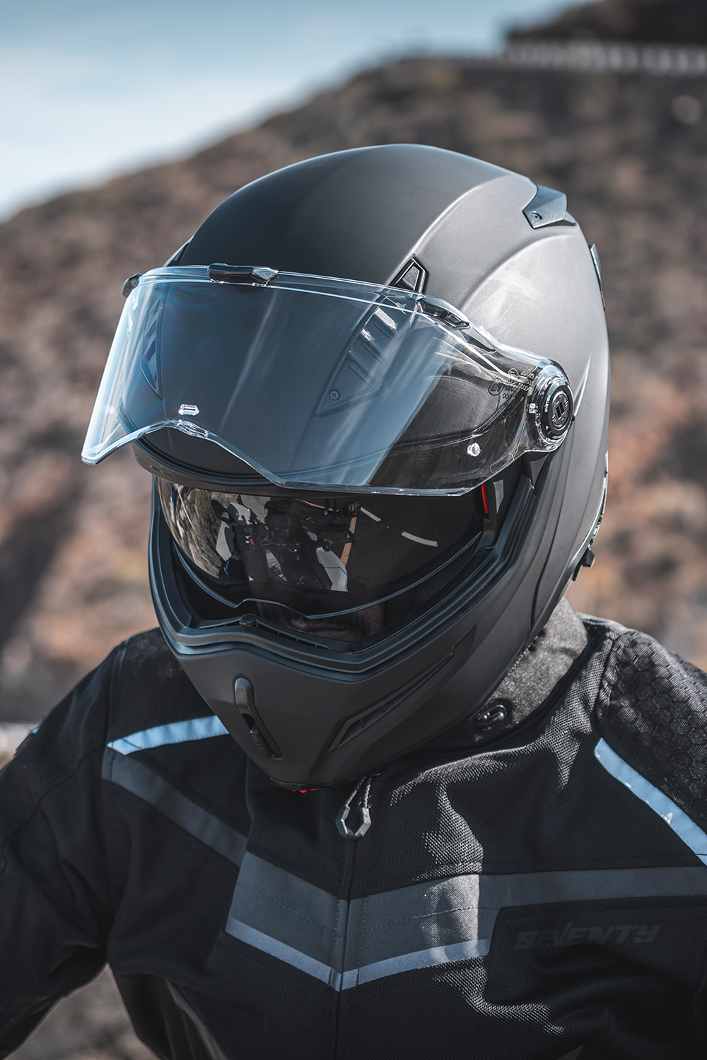 Solskärmen är helt avtagbar, vilket gör att hjälmen enkelt kan anpassas efter körstil. Den kan även användas som fästpunkt för actionkamera, vilket gör det möjligt att filma dina körningar.