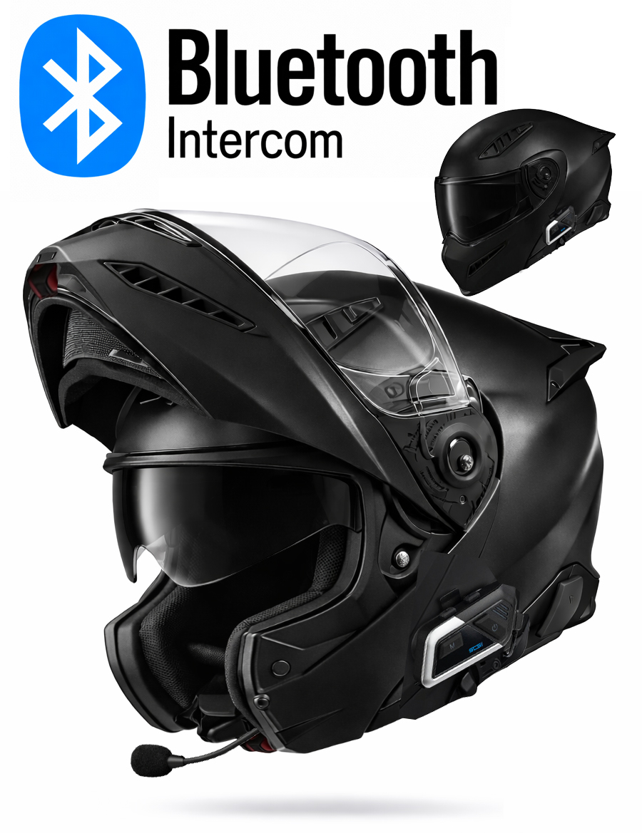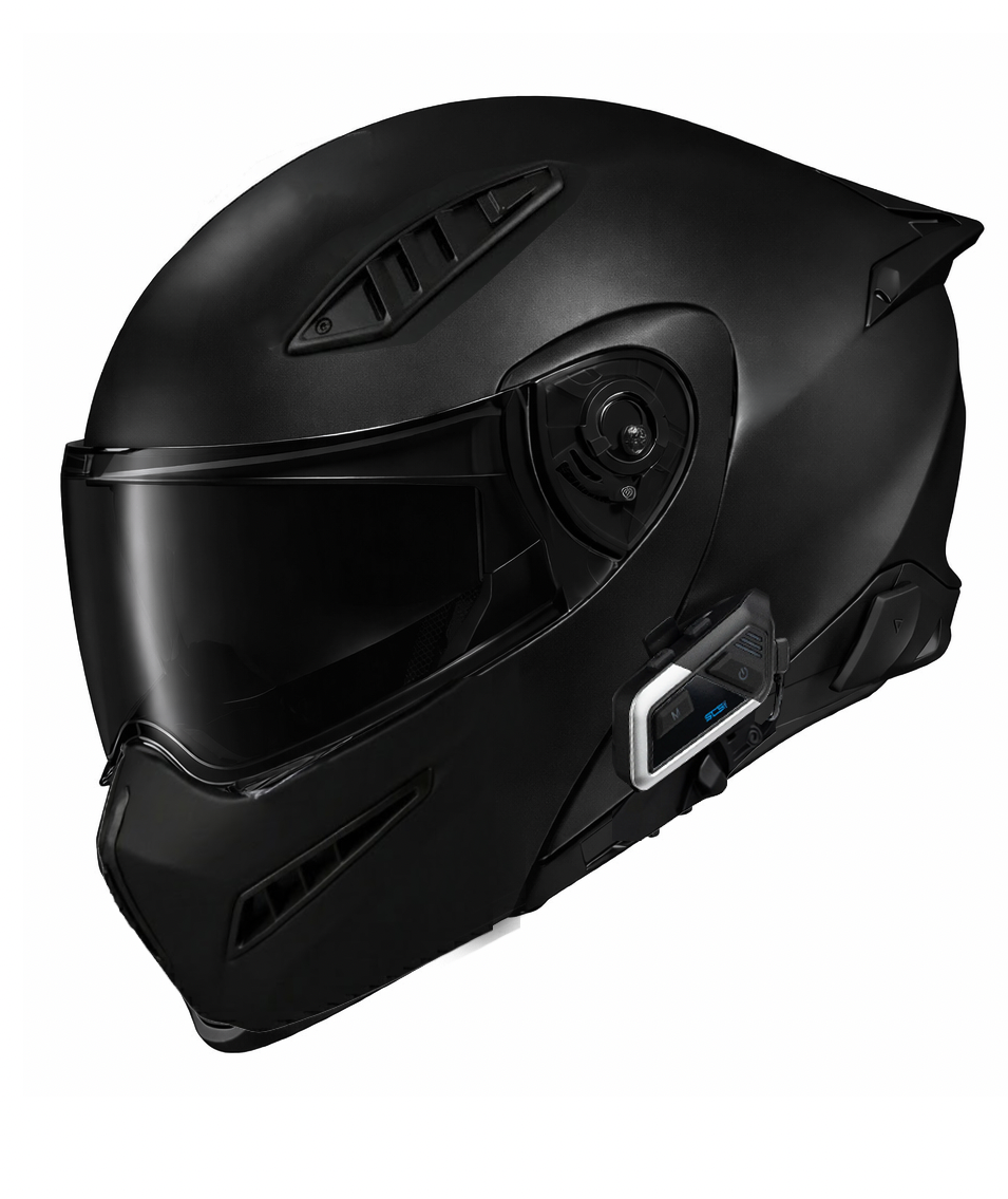 En öppningsbar motorcykelhjälm med den nya CE standarden 22.06 i matt svart med en Bluetooth 5.3-adapter som ger en förbättrad uppkopplingsprestanda och längre räckvidd. Bluetooth-enheten levereras separat men installationen är enkel och går snabbt att utföra.​